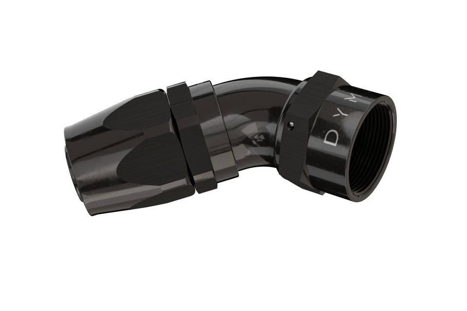 B-TYPE FATBOY AN/JIC 1-PIECE THICK TUBE, NO WELD, REUSABLE FITTING, WITH DUAL SEAL FKM SWIVEL ANGLE ADJUSTMENT, COMPATIBLE WITH SUPERSTRASSE CPE (REUSABLE TYPE) RUBBER HOSE TYPES, ANGLES STRAIGHT THROUGH 180 DEGREE. 6061-T6 BILLET ALUMINUM, BLACK ANODIZED BODY.